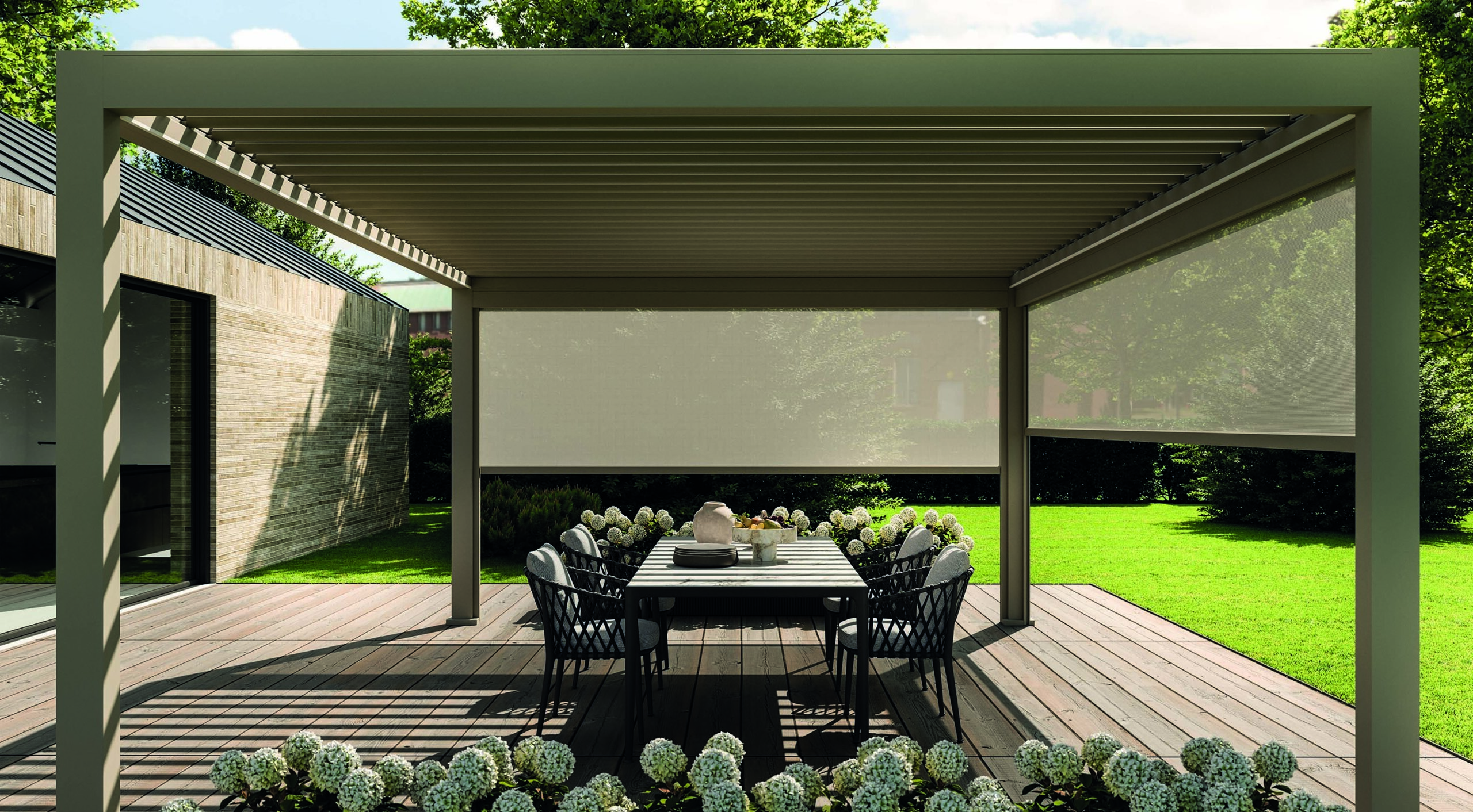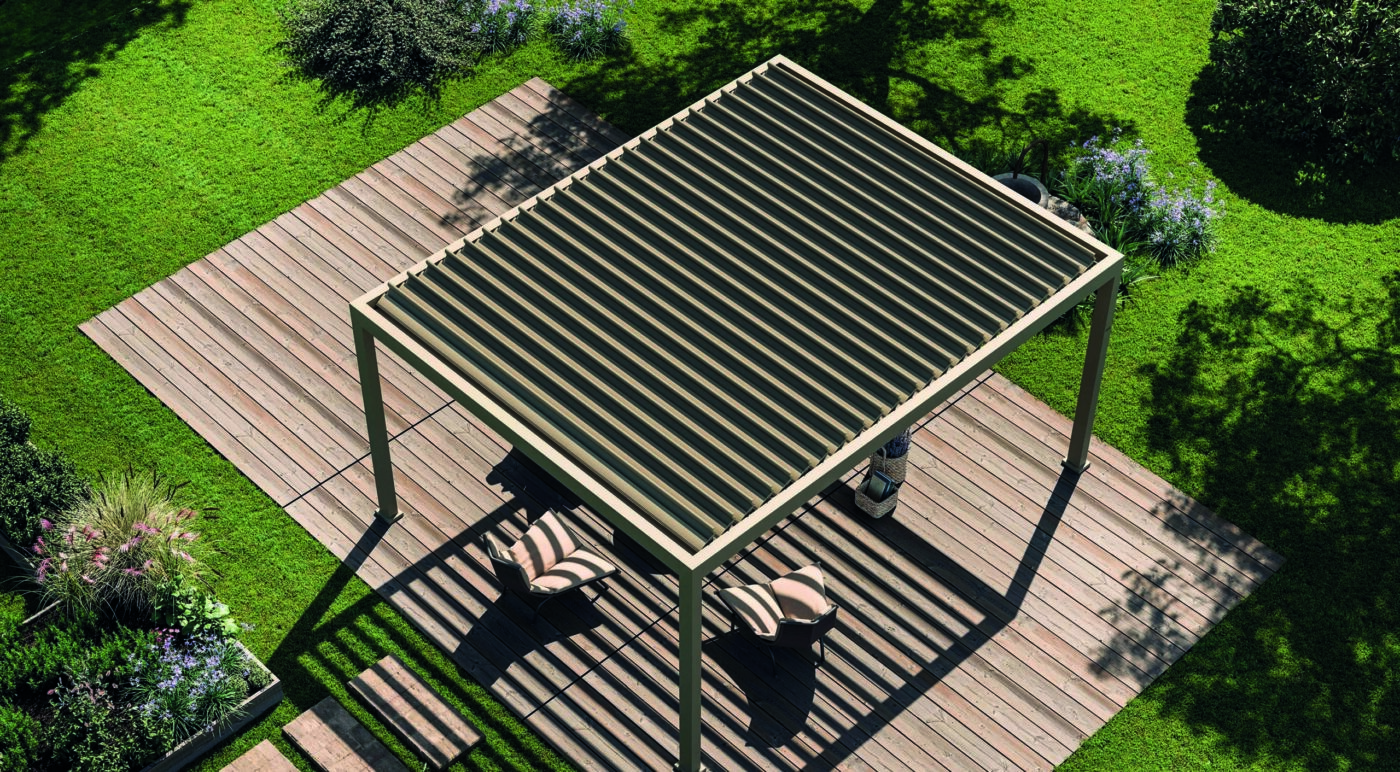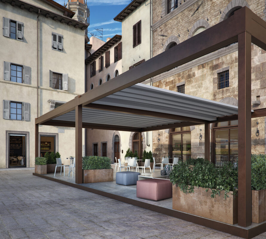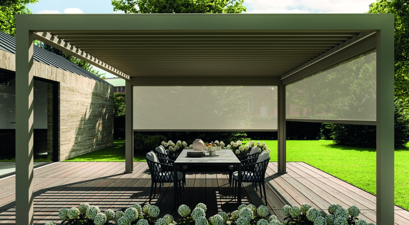 Particolare attenzione è dedicata alle pergole bioclimatiche, sistemi innovativi con lamelle orientabili che permettono di regolare luce e ventilazione naturale, garantendo comfort in ogni stagione.