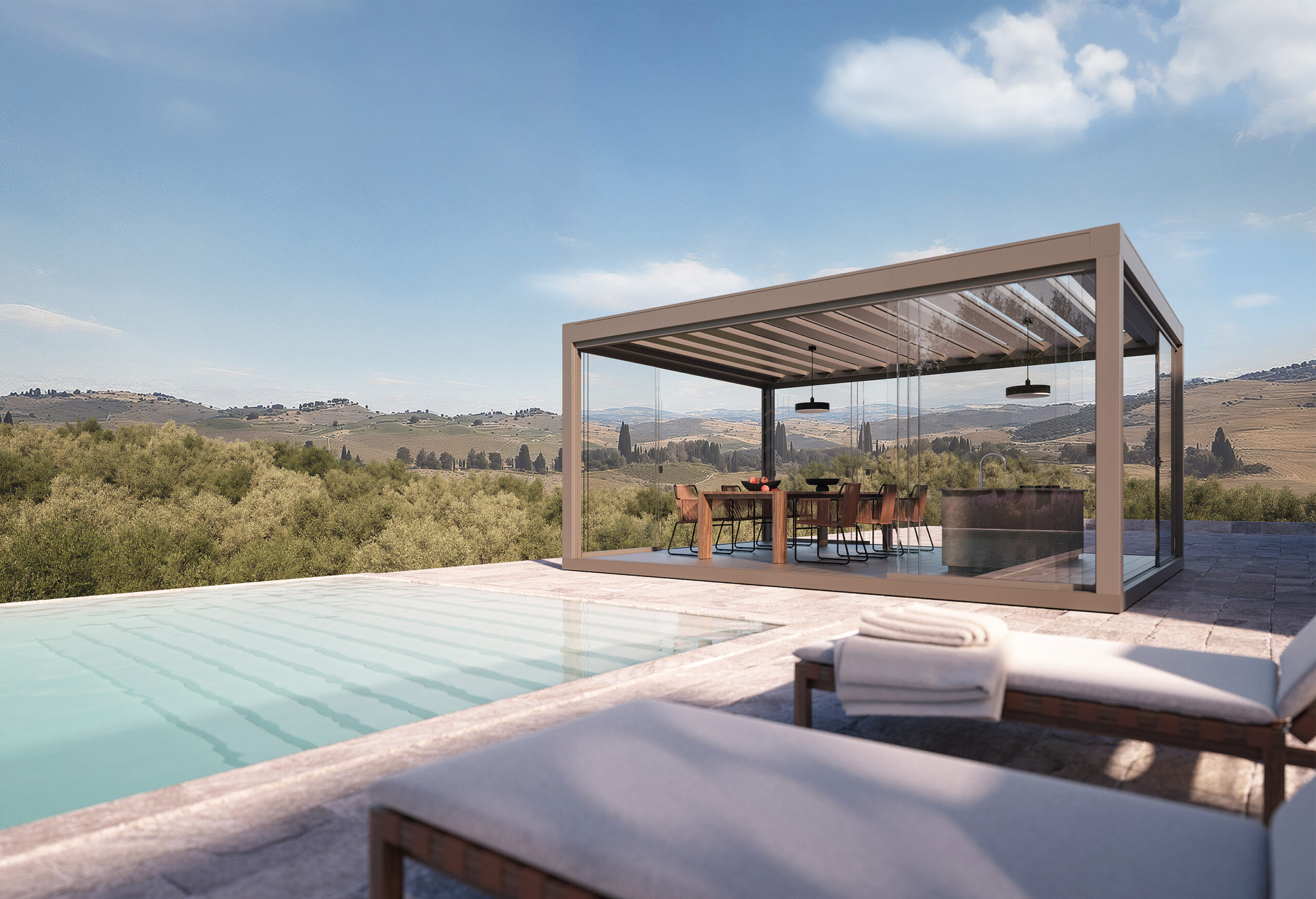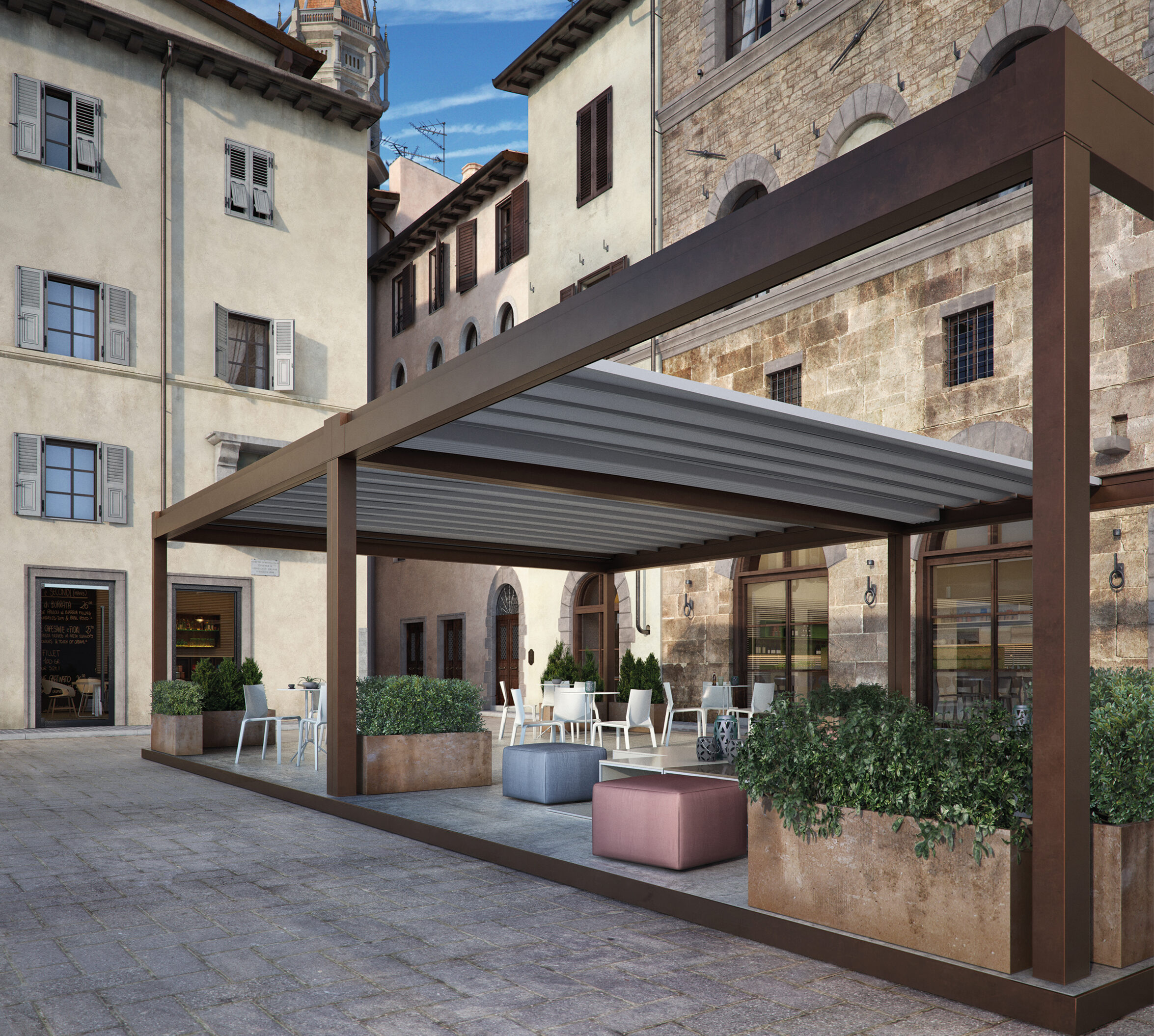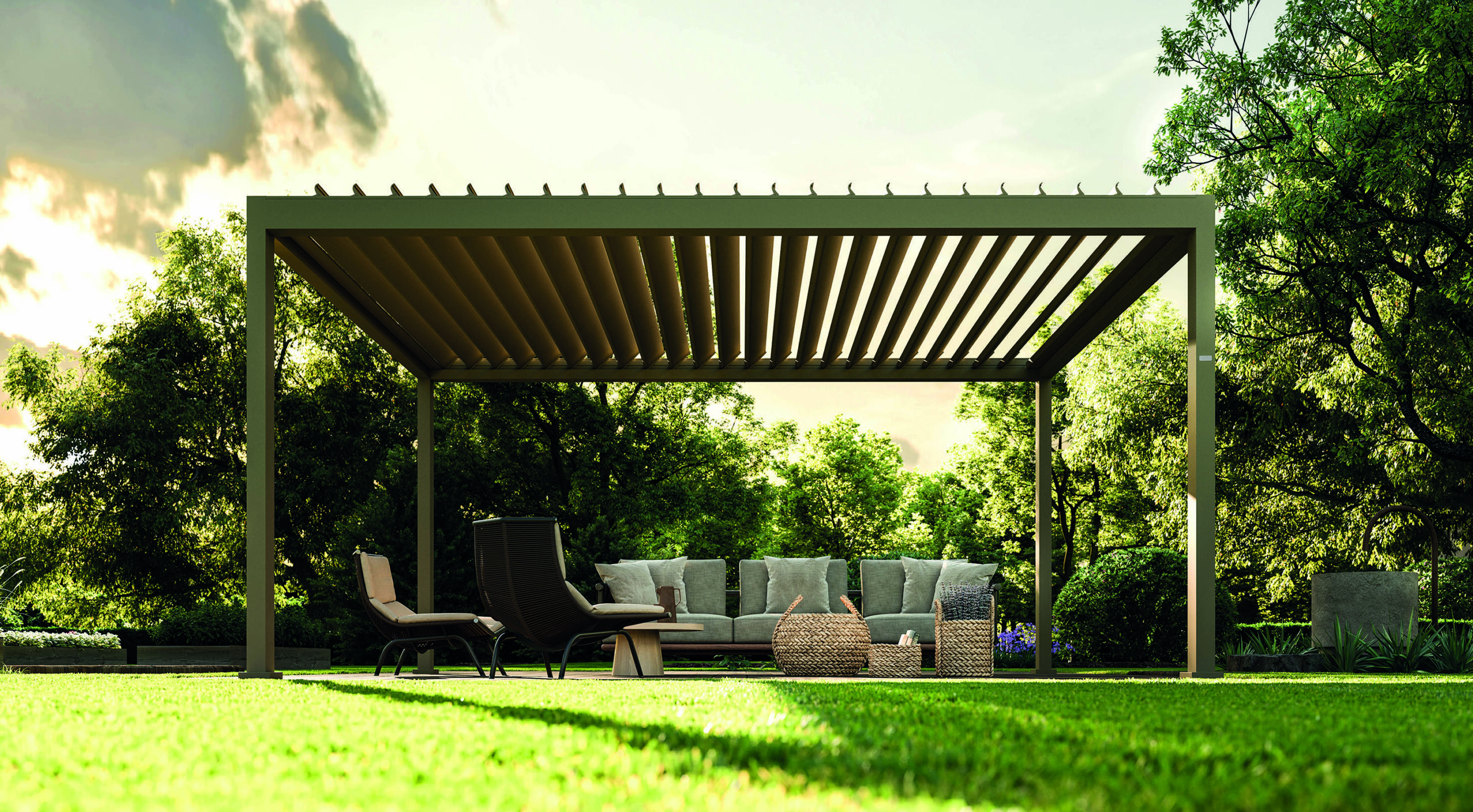 Particolare attenzione è dedicata alle pergole bioclimatiche, sistemi innovativi con lamelle orientabili che permettono di regolare luce e ventilazione naturale, garantendo comfort in ogni stagione.